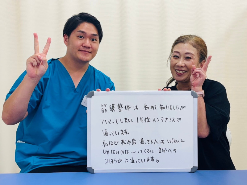 Q、当院や施術者に対してなにか感想があれば、お願いします。 A、いつも明るく声をかけてくださり、施術に行くのが楽しみでした。痛みも感じなくなり助かりました。