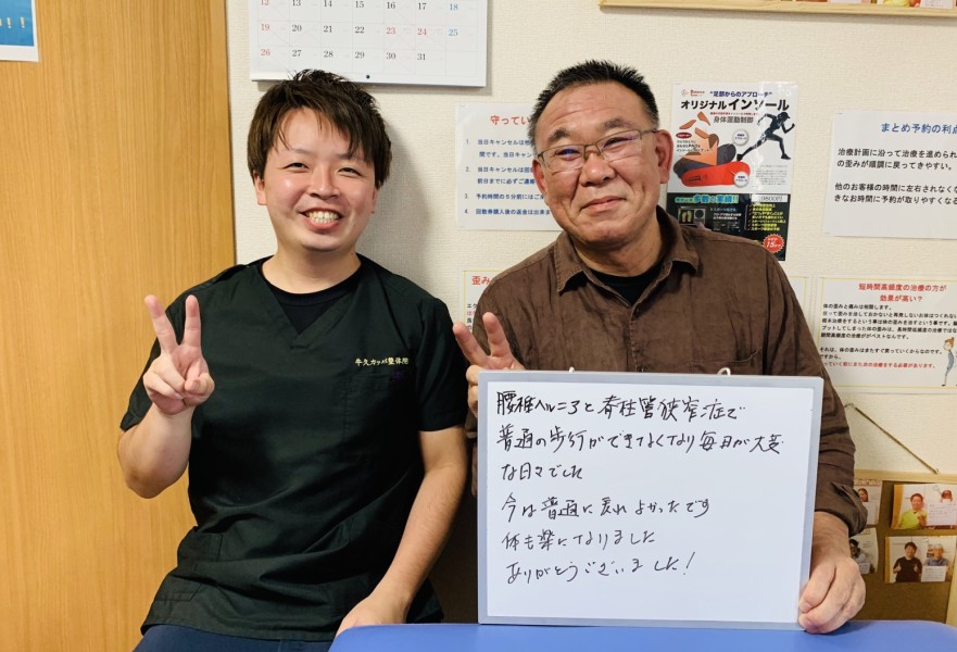 「脊柱管狭窄症で後ろ歩きで歩いてました。辛い症状から解放され気分が晴れやかです!!!」