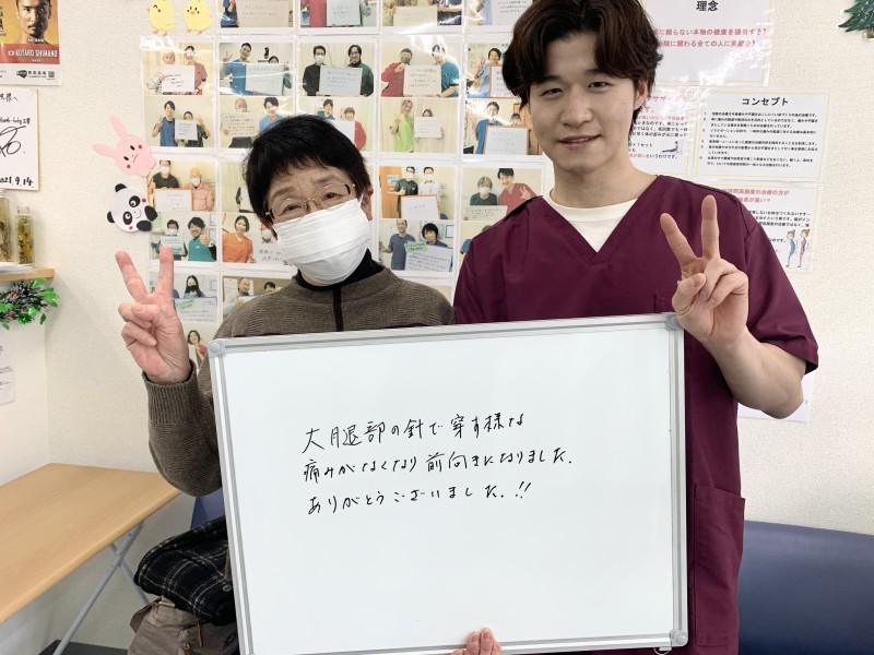 「足のしびれ、膝の痛み、痛めた肩、腰痛、通院する度改善するのが自分でも分かりました。」